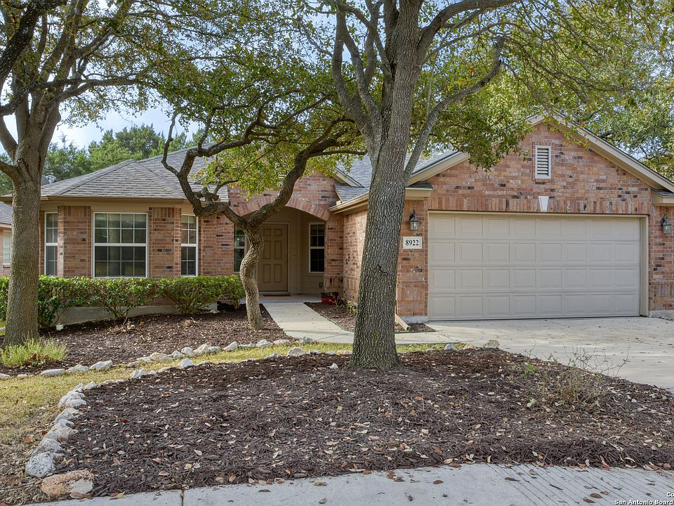 Nestled among mature trees with charming curb appeal and pretty roof peaks, this lovely home invites you in with its timeless brick exterior on three sides and warm, welcoming presence. Inside, crown molding accents the main living areas and all bedrooms, adding an elegant touch, while wood flooring flows through the main living spaces. Just off the entry, the formal dining room sits to the right-open yet subtly separated from the living room by a dividing wall with a wide walkthrough, creating the perfect space for entertaining. High ceilings and recessed lighting enhance the open feel of the living area, complemented by stylish light fixtures in the entry and breakfast nook. A wall of windows in the living room offers serene views of the covered patio and beautifully landscaped, parklike backyard that backs to a greenbelt-ideal for nature lovers. The galley kitchen features sleek quartz countertops, a diagonal tile backsplash, tile flooring, and black appliances including a built-in microwave. The private primary suite at the back of the home boasts a ceiling fan, walk-in closet, and a spacious en-suite bath with dual vanities, a walk-in shower, and a garden tub for relaxing soaks. A secondary front bedroom showcases charming bay-style windows, while a third bedroom and a nearby full bath provide comfort and space for guests or an office. The laundry room, just off the kitchen, is thoughtfully designed with cabinets above the washer/dryer hookups and built-in pantry shelves on the opposite wall. Additional features include a water softener and a peaceful, covered back porch perfect for unwinding and watching wildlife. This home offers a harmonious blend of comfort, style, and natural beauty-truly a must-see!