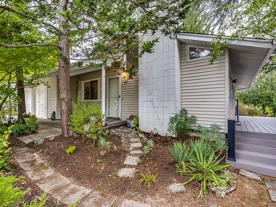 Lovingly cared for by its original owner since 1965, this mid-century gem blends timeless design with thoughtful updates. Flooded with natural light, the home features refinished wood floors, fresh paint, and a smart, easy-living floor plan. The bright living room, complete with a wood-burning fireplace, opens to a formal dining room and a well-designed kitchen with abundant storage, newer appliances, skylights, and a cozy breakfast nook. Three comfortable bedrooms and a full bath with a stepless walk-in shower make this an ideal one-level home for convenience and accessibility. Step outside and discover one of the property’s most enchanting features: an oversized, newer Trex deck that feels like it’s nestled in the trees. Perfect for entertaining or simply relaxing, it extends your living space into a park-like corner lot with mature landscaping and garden beds that change beautifully with the seasons. Practical amenities include a spacious attached two-car garage — great for parking, storage, or hobbies, plus updated windows for year-round comfort, new HVAC system and a working washer and dryer. Move-in ready, this special home offers mid-century character, modern ease, and an outdoor living experience you’ll want to enjoy every day.