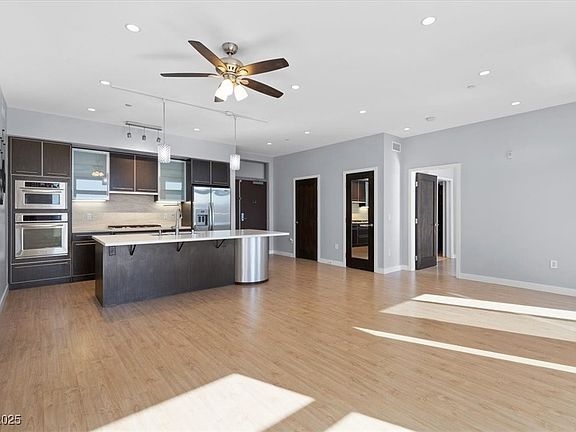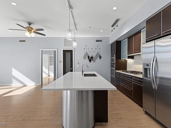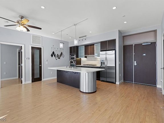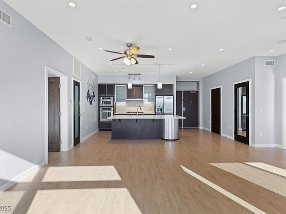 One of only two units with this open 1,321 sq/ft layout! Fabulous Resort Style Living!!! ***Does not share walls with any other units.*** Single stand alone building with one unit below - no unit to the sides/above. 2 Beds, 2.5 baths in this contemporary, very well maintained condo. Stainless steel appliances, Quartz countertop, LVP floors in living areas and bedrooms, travertine counters and porcelain tile in bathrooms. Both bedrooms separately located and have private en-suite bathrooms. Delta Rainfall Shower System and Large Soaking Tub in Master. Dimmable LED & Low Voltage Lighting throughout. Built-in Murphy bed with storage in Bed 2 is quite the space saver. Walk-In Closets with closet organizers in both Bedrooms. Designer Lighting in Both Bedrooms & Baths. Two subterranean reserved parking spaces. Elevator for your convenience. Too many amenities to list!!! Enjoy the strip and mountain views from the balcony!