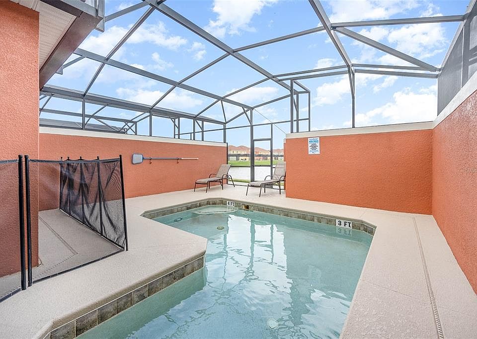 This 4-bedroom townhome has and AMAZING WATER VIEW, a splash pool and is mere steps to the clubhouse! This home is turnkey and ready for a new owner! Located in the highly desirable resort, Paradise Palms... an investor or owners dream. The community allows short term rentals; long term rentals or full time residence for those looking for resort living every day! Upgrades include – new furniture; decor; linens; bedding; living room TV with built in DVR and more. Step through the front door to a lovely foyer entrance; one bedroom and full bathroom are to the right. Continue through the foyer to an open floor plan with open views of the pool area from the kitchen, living and dining room! The kitchen with granite counters has an oversized breakfast bar. Continue through the foyer to an open living space including the dining room and kitchen. The gallery style kitchen is oversized with a breakfast bar, perfect for socializing and entertaining. Enjoy meals and cocktails on the screened patio, covered lanai and sparkling pool. All this with a serene water view and no rear neighbors! Upstairs you’ll find a spacious master retreat with a king bed and a dual sinks in the bathroom. An additional 3rd and 4th bedroom are down the hall upstairs, separating the master for privacy. This 24-hour guard gated community is lined with gorgeous palm trees through the entrance, leading to the spectacular clubhouse. The clubhouse is astonishing and brief walk from the townhome, convenient for all. Community features include onsite concierge; gorgeous resort pool with zero entry and waterfall; spa; theatre; large game room; fitness center; sundry shop; tiki bar & grill; sand volleyball; tennis and basketball courts and playground. The HOA includes basic cable, phone, internet, landscaping and common grounds. The location is fantastic, close to Disney, other attractions, restaurants, shopping, Margaritaville, theatre, bowling, major highways and more! All room, home & lot size are estimated. Exact measurements; HOA fees/requirements; transfer/capital contribution fees are the responsibility of buyer or buyer's agent/broker.