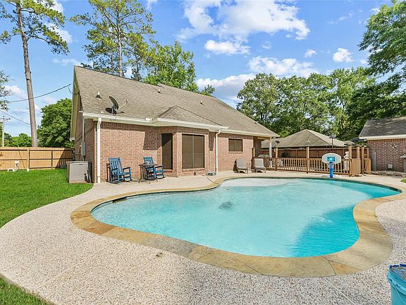 Courtesy of Better Homes and Gardens Real Estate Gary Greene - The Woodlands Nestled in a prime location off County Road 2627 and zoned to Cleveland ISD, this charming brick home offers comfort, character, and convenience. A welcoming covered porch leads into a spacious living room with soaring ceilings, abundant natural light, a cozy wood-burning fireplace, and custom built-ins. The bright breakfast room with bay windows flows into a cozy kitchen featuring white shaker cabinets, a gas range, and stainless steel appliances. The bedrooms offer comfort and functionality, enhanced by custom storage solutions, while the primary suite boasts a generous walk-in closet. Additional highlights include an in-house utility room, a wet bar, and a fully fenced backyard oasis complete with a sparkling in-ground pool and an updated pool houseperfect for Texas summers. This inviting home is move-in ready and waiting for you to make it your own!