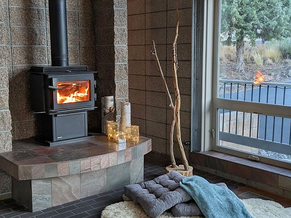 Hot tubBasalt water featureExpansive mountain viewsHigh-end finishesWood burning stoveLight-filled great roomArtisan tile