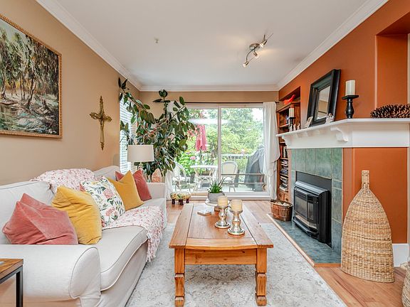 Corner unit townhouseUpdated living spaceBright open-concept kitchenDining areaGas fireplaceLarge private deckNew kitchen cabinet doors