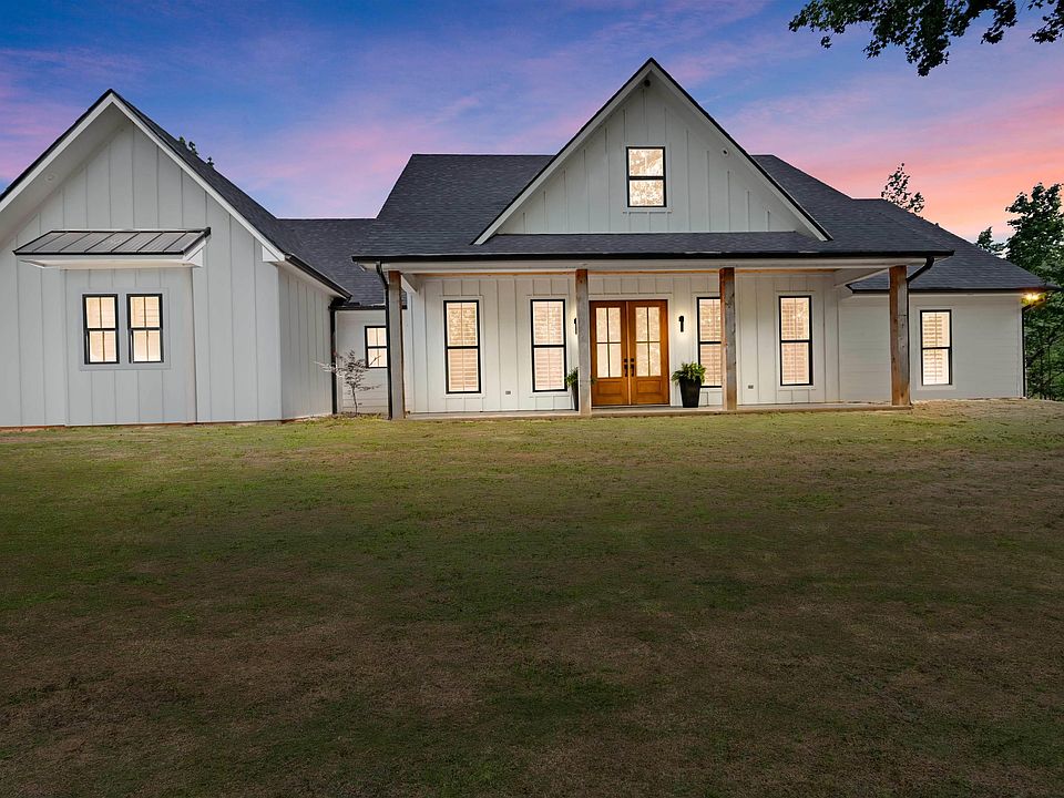 This exquisite custom modern farmhouse is nestled within the serene confines of a prestigious gated community. It is the perfect blend of contemporary design, rustic charm & offers a peaceful retreat. It is located at the end of a cul-de-sac & has a private winding driveway that takes you through beautiful trees & nature where you are hidden away from street view. This home boasts a spacious front porch & a screened in back porch-perfect for enjoying tranquil evenings & watching the local wildlife. Upon entering, you are greeted by an open-concept floor plan that offers a seamless flow between living, dining, & kitchen areas. High ceilings, wood beams, & resilient LVP floors create a warm & inviting atmosphere. Custom Plantation blinds throughout! The living room features a cozy fireplace & two large sliding doors out to your screened in patio with a wood burning fireplace that offers stunning views of the surrounding nature. The kitchen is a chef's dream-all SS appliances, convection oven, custom cabinetry, hammered stainless farmhouse sink & a large island that doubles as a breakfast bar. The master suite is a true sanctuary with a trey ceiling, a luxurious ensuite bathroom with a soaking tub, walk-in dual-head shower, dual vanities & direct access to the laundry room. It also has a private office-craft-hobby room with tons of natural light & views of the amazing nature outside. Living in this gated community means enjoying an array of exclusive amenities. The neighborhood is committed to preserving local wildlife & habitats, making it a haven for nature lovers. There are also about 11 miles of private roadways for walking & biking. Wild Zebras, 4 species of deer, ducks & many bird species all make their home here in Safari Waters Ranch, adding to the charm & tranquility of the area. This harmonious coexistence with nature is a rare & treasured aspect of life here. It has 3 spring fed lakes that are stocked with trophy bass, crappie, bream & catfish!