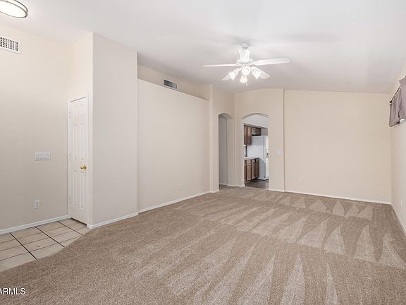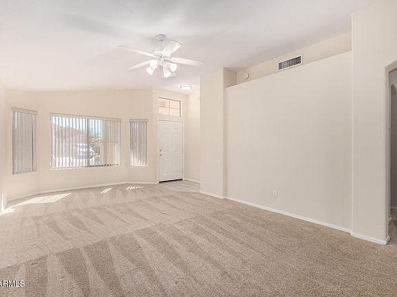 Freshly painted, well maintained three bed/two bath home on a cul-de-sac street w/mountain views * Enter through the formal LR/DR, leading into the large open KIT/FR combination, great for the cook who likes to entertain * Primary bedroom features a den(sitting room) & ensuite with large shower, dual vanities, walk-in-closet & private toilet room * Vaulted ceilings, and ceiling fans throughout * Large laundry room w/sink * Low Maintenance desert backyard w/ storage shed * Covered patio for outdoor enjoyment * Newer AC 2024 * Refrigerator, washer and dryer convey ''as-is'' * Storage cabinets in garage for extra storage space