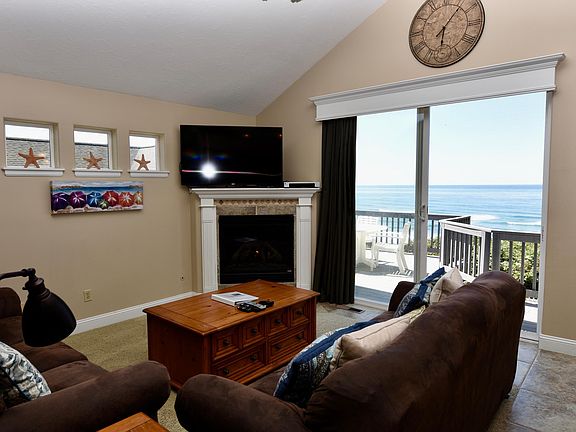 Oceanfront home with stunning views from almost every room in the home. Modern Kitchen with granite counters, nice cabnitry and breakfast bar. Dining Room has the best views you could ask for while dining and tile floors. Living room with gas fireplace and sliding door onto large oceanfront deck with sitting area and Hot tub. Master Bedroom, has fantastic views and it's own deck, attached spacious master bath with Jetted tub, custom step-in shower. Lower level has two more spacious bedrooms, a full bath with shower and a fabulous family room with a wet bar, mini fridge and sink and ocean view patio. lot is large with lots of flat back yard space. Large two-car garage, plenty of parking and a great neighborhood with deeded trail to the beach. This house built in 2004, is well maintained.