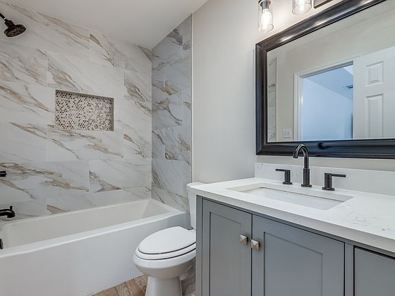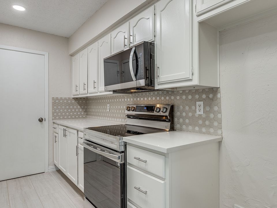 Modern fixturesElectric fireplaceRecessed lightingTiled backsplashQuartz countertopsNew deckAbundant cabinet storage