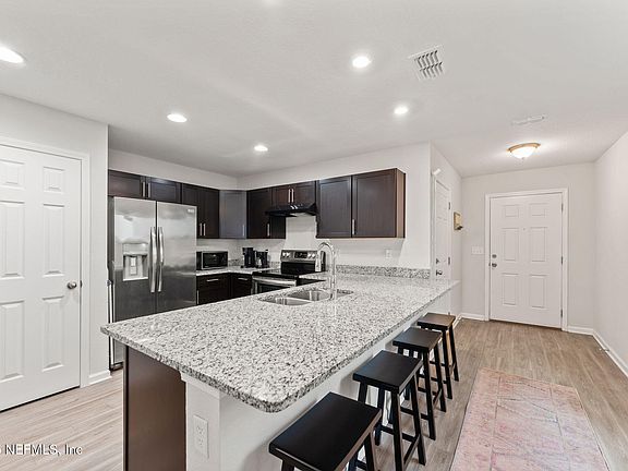 Centrally located near Downtown Jax, and St. Johns Town Center, this 4-bedroom, 2.5-bath home features an open floor plan with wood-look vinyl flooring throughout. The kitchen overlooks the spacious living area and boasts a large island, abundant cabinetry, and a separate pantry.