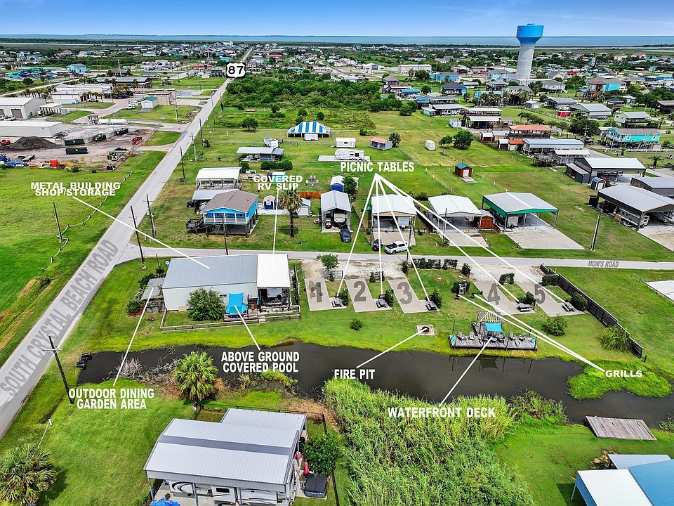 Discover this unique opportunity to own a fully operational RV park with 5 RV spots in the heart of Crystal Beach. Each thoughtfully designed space includes its own raised herb garden, jasmine-covered trellis, water and electricity hookups, creating a welcoming retreat for guests. A shared community deck overlooks the water, offering a perfect spot for relaxation and gatherings. Additional amenities include an owner’s covered RV spot, a convenient outdoor shower with a tankless water heater. This property also includes a 20x40 wood-frame storage facility with road frontage on Crystal Beach Road—ideal for a business, workshop, or additional income opportunities. A portion of the storage facility is temperature controlled, expanding its usability for multiple purposes. The owner’s RV and rental business inventory can be negotiated in the purchase, making this a truly turnkey investment with immediate income potential. This property has amazing possibilities and is waiting to be yours!