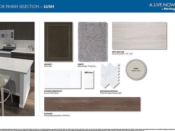 Kitchen island opens to the family and dining room areas. Upstairs bedrooms, game room, and pocket office. Slate cabinets with off-white quartz countertops, warm grey EVP flooring with gray beige tweed carpet in our Lush package.