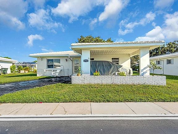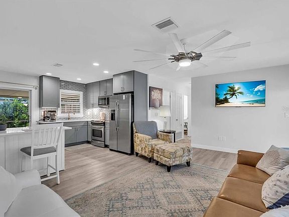 This single-family residence has been extensively renovated and is situated within a small, age-restricted community for individuals aged 55 and older. The homeowners association (HOA) fee of $80 a month includes select exterior maintenance services such as lawn care, roof cleaning and painting, and upkeep of the private road. The residence features an open floor plan with new flooring, shiplap walls, updated lighting fixtures, and ceiling fans throughout. The eat-in kitchen is equipped with stainless steel appliances, new cabinetry, solid surface countertops, and a tile backsplash that extends to the ceiling. The home contains two updated bathrooms and an oversized, stackable stainless steel washer and dryer located within the unit. Several windows have been replaced with impact-resistant models, and the front door has also been upgraded with an insulated door. Bedroom closets are fitted with barn-style doors, and all windows are furnished with drapes. The furnishings in the home including the bedding are also new. The property may be offered fully furnished and ready for immediate occupancy. Recent renovations include a new kitchen, solid surface countertops, windows and new flooring throughout the residence. The wall separating the kitchen and living room has been removed to create an open layout. Additional improvements comprise of new windows, updated plumbing and electrical, and in 2022 the air conditioning (HVAC) system, new interior doors, wood trim, and an insulated front door with nice glass front and password access. Conveniently located near shopping and restaurants. It is approximately 5 min to Warm Mineral Springs, 20 min to Englewood Beach, and under a half hour to Downtown Venice, Venice Beach, Sharky's, the Venice Fishing Pier and Dog Beach.