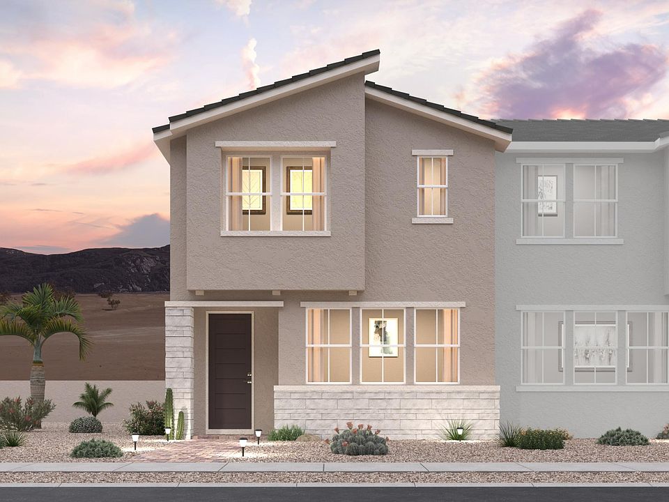 Delray plan at Arroyo at Skyeview in an end unit that offers stylish two-story townhome living with a 2-bay garage, courtyard entry, and a thoughtfully designed layout within the desirable Skye Canyon planned community. This plan features 3 bedrooms and 2.5 baths, this home balances comfort and convenience for today's lifestyle. The main level showcases an open-concept design that connects the great room, nook, and modern kitchen with a center island and pantry. The layout is ideal for entertaining or everyday living. Upstairs, you'll find, a versatile loft, two secondary bedrooms, a full bath and a conveniently located laundry room. The private owner's suite provides a relaxing retreat with a spacious walk-in closet and bath complete with dual vanities, private water closet, and a walk-in shower. Additional home highlights include: Aria II package Snow (white) cabinets Two-tone interior paint Upgraded kitchen appliances Upgraded electrical options 9' ceilings at main level