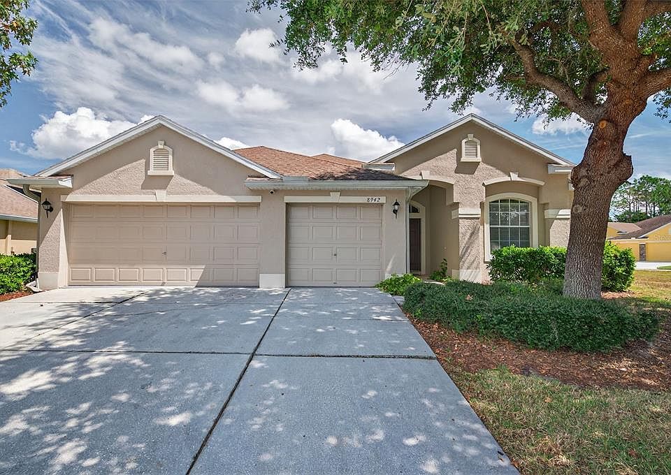 WELCOME TO YOUR EXQUISITE HOME at 8942 Sandusky Ln, New Port Richey in the UPSCALE gated community of Waters Edge. This POPULAR Savoy model features 4 bedrooms + bonus room upstairs (5th bedroom), 3 bathrooms & 3 car garage on an OVERSIZED CORNER lot of nearly 13,300 sqft or .31 acre. Key exterior features are fully fenced backyard with vinyl fencing, covered patio, reclaimed water for irrigation, carriage lights, expansive driveway, accent lighting & security system. Stepping inside, the aura feels BRIGHT & CHEERY with NATURAL SUNSHINE streaming through the multiple windows ILLUMINATING the interior together with the updated light fixtures. The OPEN CONCEPT PLAN consists of the foyer, kitchen, dinette, dining, living & family rooms. The WONDERFUL family room features wide plank textured engineered wood floors. The FABULOUS kitchen features stainless steel appliances, 42" GORGEOUS wood cabinets with MODERN hardware, Corian counters, tile backsplash laid diagonally, pantry closet & breakfast bar. After a long day, retreat to the SENSATIONAL primary bedroom suite with private bathroom. The SPACIOUS primary bedroom can easily accommodate king size furniture & has a ceiling fan, TWO walk-in closets & direct access to the lanai through a set of double glass sliding doors. The primary bathroom with pocket door for privacy consists of double sinks with split vanities, recessed lights, Corian counters with PLENTY of cabinets for storage, private toilet room, garden soaking tub and a step-in shower. A junior owner's suite is located on the opposite side of the family room & features its own private bathroom which doubles as the potential pool bath with tub/shower combo. There is a linen closet/storage room in the hall that utilities the space under the stairs for a SMART DESIGN. In this 3-way split bedroom plan, two equal-size bedrooms share another full bathroom with tub/shower combo. The BONUS room is the ONLY room located upstairs (possible 5th bedroom) & cooled with its own AC system. Design the MASSIVE bonus room in a variety of ways such as gym/exercise center, craft room, home theater, play space or possibly an in-law/guest suite. The bonus room has a GIGANTIC walk-in closet of dimensions 17' x 5.5' AND another built-in closet. This MARVELOUS home is really ONE-STORY LIVING as EVERYTHING IS ON THE 1ST LEVEL except the bonus room which is upstairs! MORE AMAZING FEATURES in this home are archway entrances into rooms, ceiling fans in all the bedrooms, family & bonus rooms, custom blinds and/or curtain rods on the windows, pre-wired for security system & location near the end of the neighborhood on a quiet street. There is a dedicated laundry room with washer & dryer included in the sale. A BRAND NEW ROOF will be installed prior to closing, both AC systems replaced in 2/2020 & water heater replaced in 2/2020 with proper county permits. Your AMAZING home was designed for entertaining & enjoying TRUE INDOOR-OUTDOOR LIVING! Take a dip in the community pool, use the gym or meet your fellow neighbors at the next social event within Waters Edge. More amenities are 9000sqft clubhouse, grand swimming pool, kiddie pool, basketball/pickle ball court, playground, dual fishing piers & boat dock leading to the SPECTACULAR 70-acre lake at its center. HOA fee includes Spectrum cable, high speed internet, reclaimed water irrigation, trash 2X week with recycling, security & community amenities. MAKE THIS YOUR FUTURE HOME!