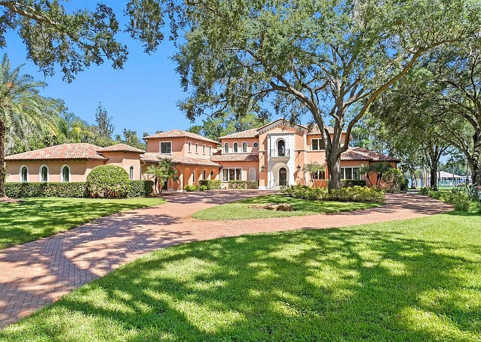 Nestled along the tranquil shores of Lake Keystone, this exceptional gated estate offers a blend of timeless architecture, refined appointments and coveted lakeside living. Offering 180 feet of pristine lake frontage and a sprawling 4.35-acres, this manicured property delivers privacy and serenity. Built by Fechtel Homes, classic architectural design provides elegant details throughout, with wood-beamed coffered ceiling, warm wood accents and stunning lake views. Light filled living spaces on the first level are accompanied by soaring 11+ foot ceilings, media room, executive office/library with fireplace and formal dining room. An elegant foyer leads to the gracious living room and family room with fireplace, offering flowing spaces and lake views. A chef’s kitchen will inspire elevated culinary expression with top-of-the-line appliances and granite counters, expansive center island, impressive wine refrigeration and butler’s pantry. Equipped with Wolf, Sub-Zero, Bosch and Viking appliances, including the added benefit of a commercial refrigerator and 6-burner range, along with a breakfast area. The gracious first floor primary suite retreat delivers a personal sanctuary with lake views, luxurious bath and dual custom closets. Additional features on the first level include a mudroom and generous laundry room with dual washers and dryers. The second level features the private spaces with 3 additional bedrooms with en suite baths and a casita/guest suite featuring living area, kitchenette, additional bedroom, full bath, and private access, perfect for guests, extended stay or multigenerational living. Captivating Florida living welcomes you outdoors through a spacious loggia to an outdoor kitchen, expansive terrace and spa that overlook meticulously maintained grounds and tranquil lake beyond. A private composite dock is equipped with electricity and offers multiple covered entertaining areas and a boat ramp for endless access to lake adventures. Additional highlights include 3 garages accommodating up to 9 cars. The detached 5-car garage provides a climate controlled interior, plus additional storage. Embrace a superior lake lifestyle in this extraordinary estate offering architectural craftsmanship and abundant natural beauty in this Odessa community. With over 4 acres of picturesque land, the property also offers the opportunity for equestrian use — buyer to verify all zoning and land use permissions with the county.