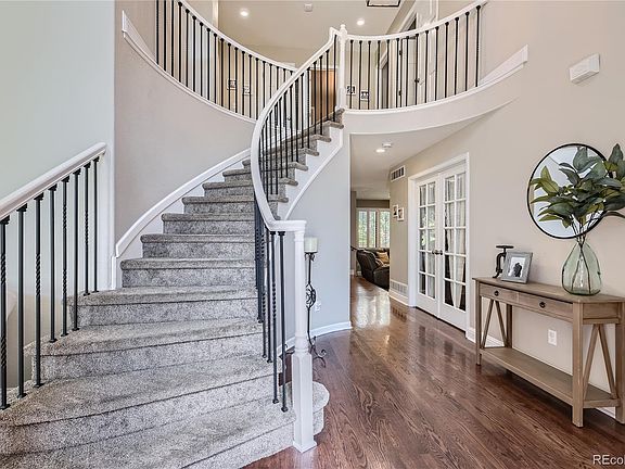 MOTIVATED SELLERS /  PRICE REDUCED. Just a half block from Cougar Run Park & Cougar Run Elementary. After walking past the manicured front yard you enter the dramatic foyer complete with high ceilings, a curved, wrought iron staircase, & warm wood floors. The natural light pours into the front of this Western facing home complete with 6 bedrooms & 4 bath. Upgrades include new light fixtures throughout the main floor, & modern 4 in. white baseboards & white Plantation shutters have been installed throughout. Many of the windows as well as the back patio door have been replaced with energy efficient Renewal by Anderson windows & doors. Ultra-private backyard w/ mature trees & ample shade. A newly poured, wrap-around concrete patio extends from the back to the front – which provides plenty of space for spending time outside with family & friends. The main floor features a versatile bedroom or office/playroom, providing flexibility for whatever you're looking for. The kitchen has white cabinets, granite countertops & stainless steel appliances. Upstairs, you'll find four generously sized bedrooms, offering comfort, privacy, & natural light. The master suite has a spacious walk-in closet, double vanity, soaking tub & a separate shower. The finished basement has a living room, an additional bedroom & a 3/4 bathroom, along with a kitchenette, making it the perfect retreat for guests, or allowing flex space for a gym/office/media room. Additional features include a three-car garage + storage, a brand new roof & new gutters installed w/ gutter guards. These recent updates enhance the home's overall appeal & ensure the home is move-in ready. Located in highly sought-after Highlands Ranch, you'll have access to top-rated schools, shopping, restaurants, coffee shops, parks & world-class recreational facilities.