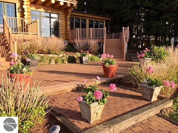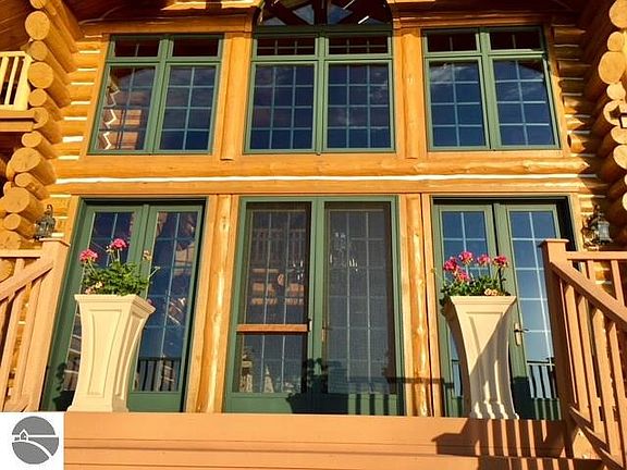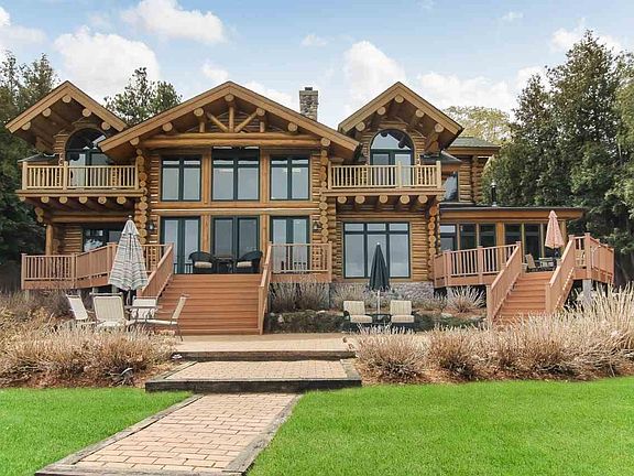 One of Glen Lakes finest homes, on the premier, sandy sunset side of the Lake. Burdickville, the unincorporated Village of yesteryear, whose post office once sat on this dirt...is now a favorite hideaway for summer or year-round living. This home is a masterful blend of subtle elegance, comfortable living, and extraordinary log construction. Architecturally exceptional, matching stone and log with size and scale, you won't believe what master craftsmen can do! Enter through cherry double doors flanked with leaded glass windows. Main level living offers easy lakeside deck access from the kitchen, family/dining room, study, and breath taking great room with cathedral ceiling and majestic field stone fireplace. An elaborate lakeside kitchen with a perfectly situated skylight provides loads of natural light. Solid surface counters, top of the line appliances, subtle LED lighting, multiple sink and work stations create a culinary haven for those who appreciate a working kitchen. Also, a guest bedroom and bath is tastefully included on the main level. The 3 bedroom, 2 bath upper level features custom tile, lake-side balconies, and many more design and architectural details to compliment the unique style of this home. The substantially finished lower level includes a large screen media room, family room, finished work shop and a storage area complete with shelves. The full log attached over-sized garage opens to a landscaped yard and guest house. The guest house sleeps 6 up, and offers main level comfortable living space plus a full kitchen. View virtual tour and photos to appreciate a birds eye view of the gentle slope to your private sandy beach, dock and lift! All you could ask for, and much more!