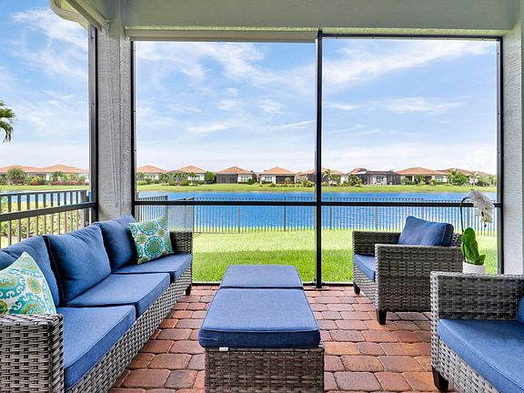 NESTLED ON A LAKEFRONT LOT and BRIMMING WITH UPGRADES, this 2BR+Den/2BA/2CG home is sure to please! The many features of this great-room style 'Casita' floorplan include glass entry front door, upgraded lighting & fans, wood-look tile flooring t/o main living areas & den, carpeted bedrooms, wood shelving in closets and much more! Entertainers will love the spacious kitchen featuring white cabinets w/ quartz counters, subway tile backsplash, apron sink, center island with pendants and waterfall edge plus dual breakfast bars! Upgraded stainless steel appliances and pantry with wood shelves! Master suite has lake views, a spa-like ensuite with dual vanities, walk-in tiled shower w/frameless glass door & spacious closet! The spare bedroom & den are located close to guest bathroom. The laundry room has cabinetry for storage and a utility sink. The two car garage is spic and span with finished flooring and plenty of room for your golf cart. Florida living is all about beautiful outdoor spaces, and this home will not disappoint! Off the great room, sliding doors open to the screened & covered paver patio which spans the full width of the home and offers plenty of room for relaxing, enjoying your morning coffee or an evening cocktail. Patio is wired for tv, so watch the game or enjoy your favorite shows all while enjoying tropical breezes and gorgeous lake views! The backyard is fenced, so perfect for those furry family members! IMPACT GLASS WINDOWS AND DOORS!!