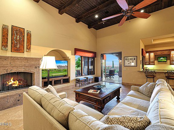 Step outside to discover a backyard with breathtaking views from Pinnacle Peak to Black Mountain. You'll find a spacious covered patio with a cozy fireplace ideal for entertaining, a refreshing pool with an elevated spa and a built-in barbecue. With its exceptional views and well-designed outdoor living spaces, it's the perfect place to soak in the sunsets and enjoy the serene desert landscape.