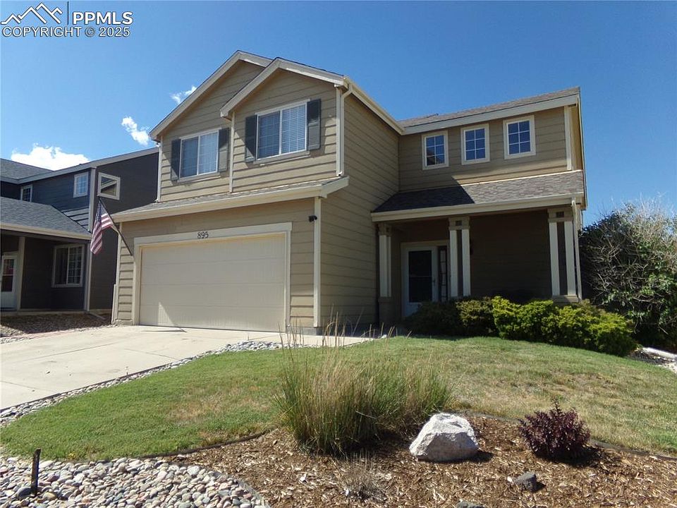 Welcome to this Beautiful Home in Countryside! The pride of ownership is obvious from the landscaping in the front of the home and the spacious driveway to the relaxing covered front porch perfect for watching the world go by! As you enter this magnificent 3 bedroom 3 bath home, your eyes will be lifted upward at the soaring vaulted ceilings and the open concept floor plan of the main Level! This home comes complete with a Wonderful Living Room with Vaulted Ceiling, Spacious kitchen with Dining area, generous Pantry, main floor Laundry and bathroom! Upstairs you will find an incredible Primary Suite with it's own Private Bathroom featuring a relaxing soaking tub, double vanity, and a spacious walk-in closet, a true retreat! With two other spacious bedrooms, one of which has a walk-in closet, and a full bathroom. Take a step outside to the back yard and you will find even more to Love! A fenced yard offers added privacy, a large storage shed and a built-in fire pit, Perfect for inviting family and friends to enjoy! This home is a true Gem, with it's Spectacular Mountain Views and easy access to nearby convenient amenities, the highway, Fort Carson, and much more! Enjoy!