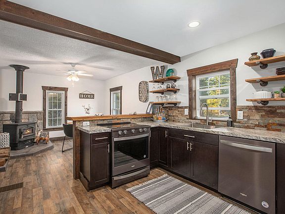 You'll love this 2.28 acre property! Located in Texas Twp and gorgeous drive to/from. This farmhouse has been nicely updated throughout most of the interior. Main floor offers new hardwood floors, updated kitchen, wood stove added for economical heat option, main floor bedroom and full bath along with adorable shiplap back entry with adjacent mudroom. Upstairs offer additional bedroom and bonus room for office, etc. The detached barn has a walkup 2nd level and provides ample storage space. Must see!