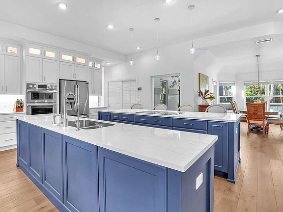 Tranquil lake viewsForward-thinking dual-island kitchen designCustom one-piece quartz countertopsResurfaced deckNew ceiling lightsCustom pantry cabinetryProfessionally designed landscaping