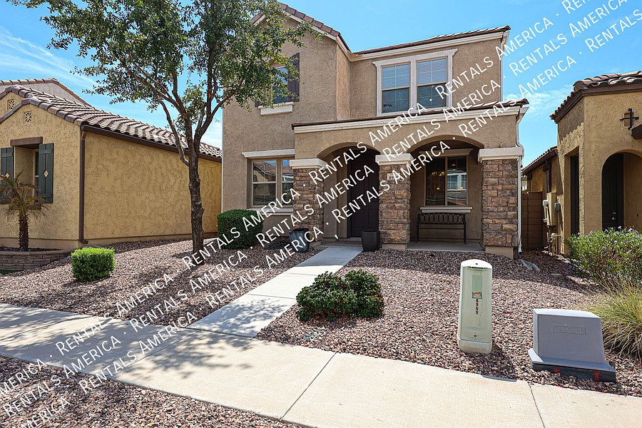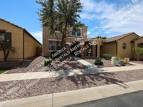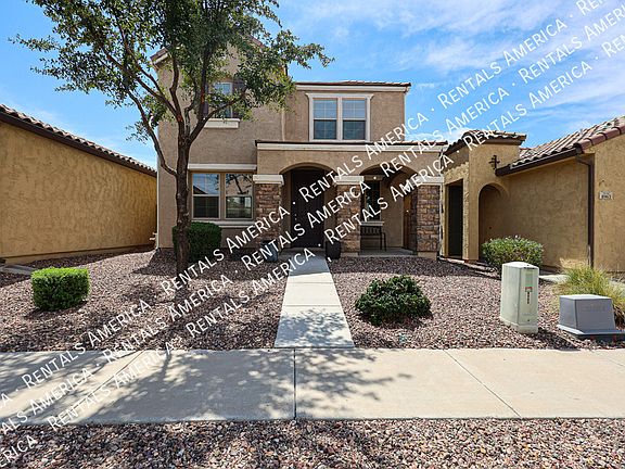 $1,000.00 OFF 1st full month's Rent if Move In by November 20th. Charming Home just minutes from State Farm Stadium & Westgate Entertainment District. A short walk to a landscaped park w/ garden fountain, swimming pool and playground. Open layout w/ family room and kitchen designed to overlook an inviting pergola covered patio surrounded by native plants & synthetic grass. Kitchen features a large island w/ bar seating & built-in sink, counter breakfast bar w/ pendant lighting, rich hardwood cabinets, double wall ovens, built-in microwave, stainless steel appliances and walk-in pantry. Upstairs has a functional split plan w/ center loft and laundry room w/ washer & dryer included. Primary Ste includes a large bedroom, walk-in shower, garden tub, double sink vanity, private toilet room and walk-in closet with open shelving.