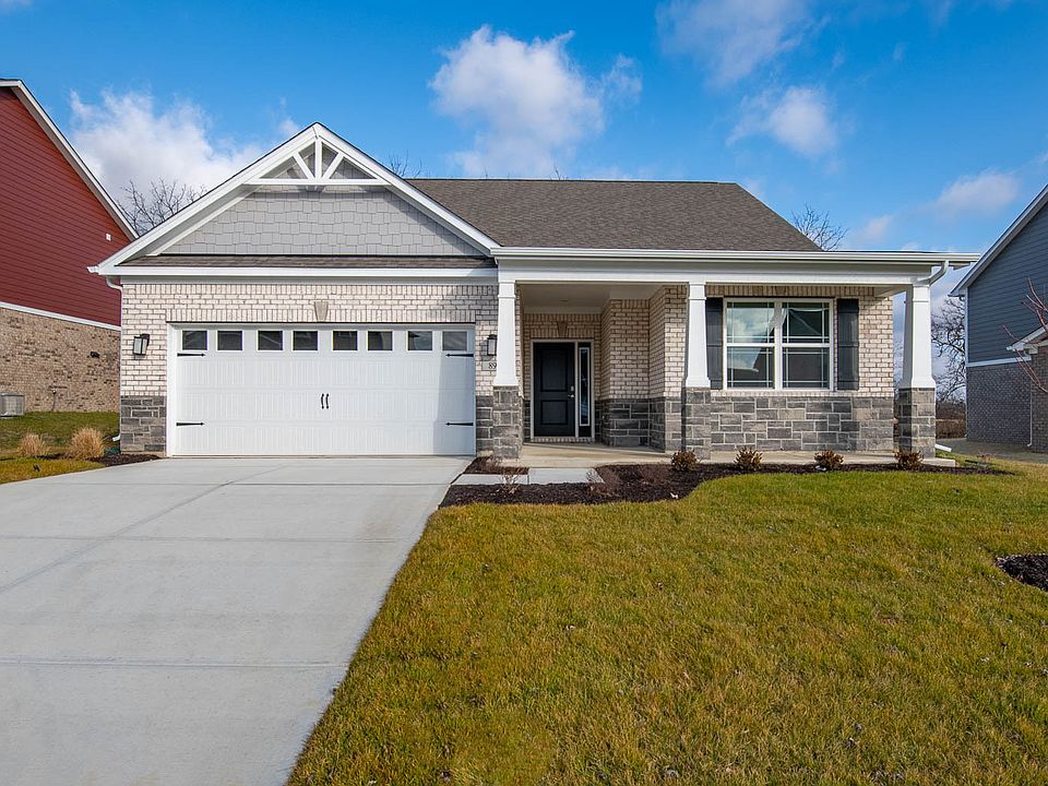 Welcome to the Heyden in Highland Knoll. This home offers 3 bedrooms, 2 baths, a dining or flex area, 2 car garage and full brick wrap. The large great room is open to the dining area and kitchen which is perfect for entertaining. Kitchen is beautiful with upgraded cabinets, island, quartz countertops and durable RevWood flooring. Relax in your Bedroom 1 retreat and enjoy the tiled shower, double bowl vanity, garden tub, walk-in closet and private commode. Patio for grilling and enjoying time outdoors. Find the best of both worlds in Highland Knoll as you appreciate the small town charm but also the close proximity to brand new Kephart Park, entertainment, shopping and dining. The home includes America's Smart Home Technology featuring a smart video doorbell, smart Honeywell thermostat, Amazon Echo Pop, smart door lock, Deako plug 'n play light switches and more.