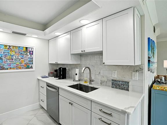 Embrace the ultimate coastal lifestyle at Sportsmans Cove Yacht & Racquet Club on Fort Myers Beach! This beautifully remodeled and furnished 1 bedroom 1 bath condo offers luxurious living with unbeatable bay views where dolphins play and your private dock is just steps away. The open layout features marble finish tile floors, crown molding, and a stunning kitchen with white shaker cabinets, quartz countertops, and stainless steel appliances. Relax on your front patio with outdoor storage, perfect for enjoying the breeze or morning coffee. The location is ideal, just minutes to Tina’s Bar, Doc Ford’s, and Parrot Key, with the bridge to Fort Myers Beach right nearby, giving you quick access to the sand, restaurants, and nightlife. Enjoy resort style amenities including a heated bay front pool, tennis courts, fishing pier, private dock, boat ramp, and boat storage. Whether you’re looking for a furnished vacation getaway, investment property, or your own slice of paradise, this condo delivers it all , location, lifestyle, and breathtaking views!