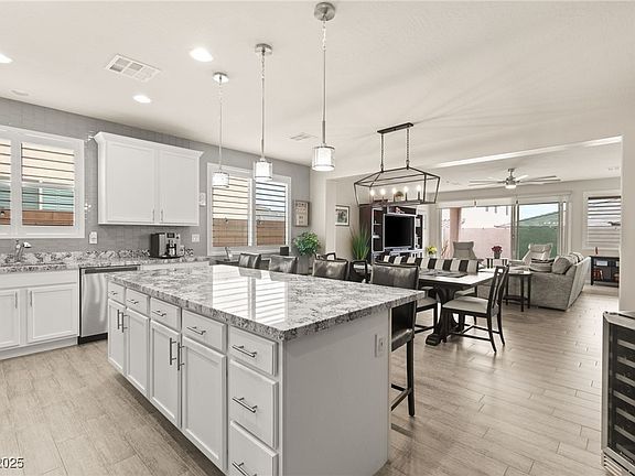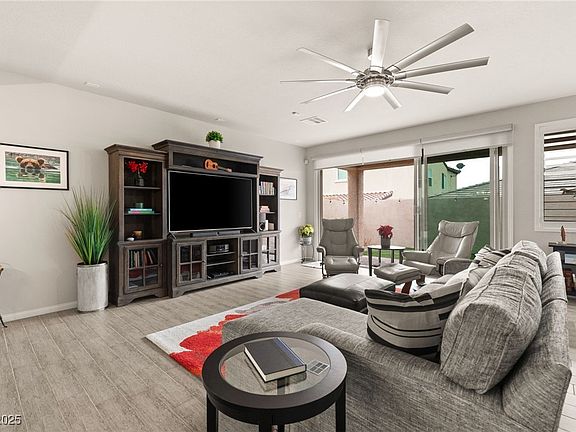 Stunning, highly upgraded single-story home in guard-gated Rhodes Ranch! This 3-bed, open-concept home features wood-look tile in main areas and plush carpet in bedrooms. The gourmet kitchen boasts a granite island, custom backsplash, pendant lighting, and stainless steel appliances. A fully paid-off solar system with two Tesla Powerwalls provides top-tier energy efficiency. The private primary suite includes a walk-in closet with custom cabinets, a soaking tub, and separate shower. Additional features: upgraded shutters, water softener, and spacious laundry room. The Great Room seamlessly extends to an inviting outdoor living space through a panoramic sliding glass door, perfect for entertaining. The oversized covered patio, custom firepit, and fully finished backyard walls and string lights create an intimate and stylish setting. Enjoy resort-style amenities: golf, pools, water slides, fitness center, sports courts & more—all just minutes from Red Rock, the Strip, and the airport!