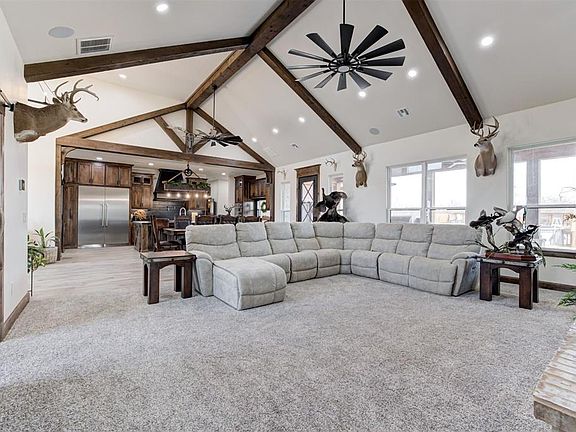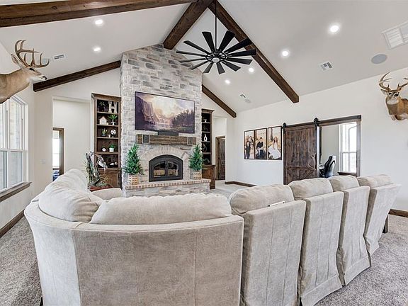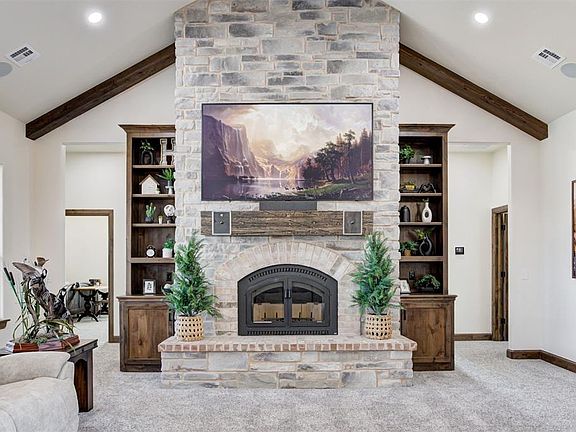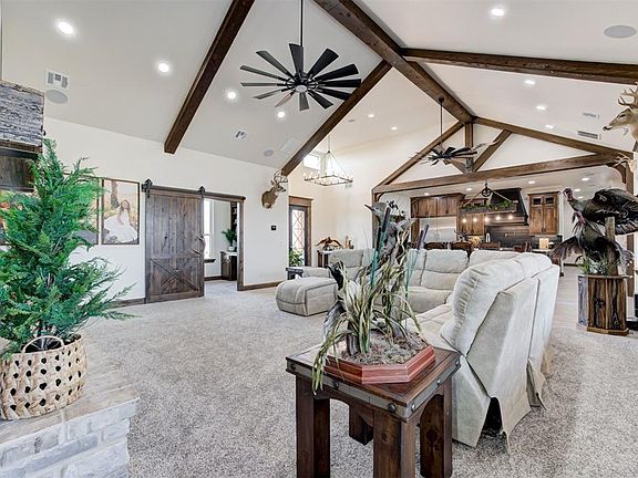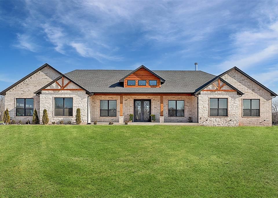 Welcome to this stunning Craftsman home completed in 2023, nestled in a serene setting with picturesque views of a tranquil pond and dam, offering a true retreat from the everyday. Step outside and experience the ultimate in outdoor living, with a pool and deck, expansive covered patio, and an outdoor kitchen perfect for entertaining guests. Surround sound speakers enhance the experience, creating the ideal atmosphere for relaxing or hosting gatherings. The property boasts a well-maintained landscape, with front and back yard irrigation provided by a well water sprinkler system, while rural water supplies the home itself. As you enter through the luxurious Monte Cristo Ironworks doors you'll find top of the line Thermador appliances, with multiple ovens, offering exceptional quality and performance in the heart of the kitchen.The living room hosts the Luxury 44 Elite fireplace rated to heat over 3500 sqft. This spacious home also features a dedicated office space, a beautiful butler pantry, and an expansive master suite complete with a walk-in closet and a master bathroom that boasts a large walk-in shower for ultimate convenience. Outside, you'll find a massive 40x80 shop, foam insulated for year-round comfort, with its own water supply, abundant electricity, and propane. The shop is equipped with 5 12x14 overhead garage doors, ideal for any project or storage need. Plus, the property includes 1,000 sqft of build-out living space, with 2 bedrooms and 1 bath, and full kitchen, bringing the total square footage of the home to a generous size of 4,351 Sqft. For added peace of mind during the uncertain Oklahoma weather, there are storm shelters; one for each the home and the shop in addition to a generously sized generator for the main home. This home has it all—don't miss your chance to make it yours!