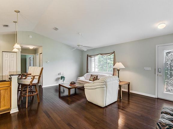 Popular open floor plan Chesapeake model on a corner lot in the gated community of Del Webb Spruce Creek. This one owner home has beautiful hard wood floors in the kitchen, living and dining rooms. The kitchen has designer granite counter tops with an island and two pantries. Sliding doors in the dining room lead to the 20 x 12 Florida/Bonus room. Large owner's suite has a walk-in closet and bay window and well laid out on-suite. Split bedroom plan and the second bedroom has a walk-in closet, linen closet in hallway with close proximity to the guest bathroom. Inside laundry has loads of storage and the washer and dryer are included. Enjoy all the amenities of this resident governed community.