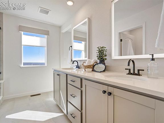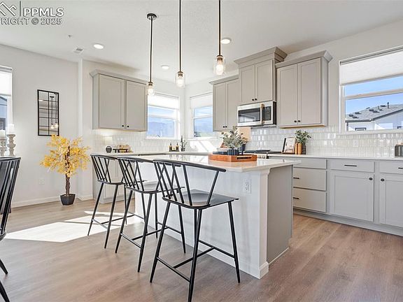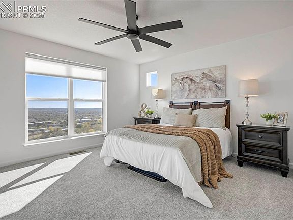This stunning 3-story home sits on the prime lot & is packed with upgrades — offering sweeping city & mountain views! Step inside to find light, neutral tones, fresh interior paint & an open-concept main level designed for effortless entertaining. The largest floorpan includes a spacious kitchen which shines with large island, custom soft-close cabinetry, quartz counters, granite sink, walk-in pantry with 110 outlet & premium Café appliances (range & microwave) — perfect for the home chef. From the main level, step out onto your walkout deck & take in the open space & breathtaking city views — the ideal spot to unwind or entertain as the sun sets over the city. Upstairs, a cozy nook/desk makes a great home office or study area, while the primary suite features a large picture window, walk-in closet & a beautifully upgraded bath with tiled shower, handheld nozzle, & backlit mirrors. 2 additional bedrooms and a full bath complete the upper level. The lower level offers incredible flexibility with a 2nd primary suite featuring its own living area, kitchenette & private bath — perfect for guests, multi-generational living or income potential! Every detail has been thoughtfully upgraded, including: Soft-close cabinetry throughout Finished, insulated garage w/ epoxy-coated floor, storage racks, & EV wiring First-floor tile flooring, luxury LVP, upgraded carpet & pad throughout Powder-coated custom stair rail Ceiling fans 2 Laundry areas Tankless hot water heater & 14 SEER HVAC Top-down/bottom-up blinds throughout Custom driftwood tile wall in living room Backlit mirrors in ½ bath & primary Exterior lights on photo cell/auto switching & added matching balcony light Transferable warranty included! Forget yard work — just relax & enjoy or explore the nearby walking path that leads to a city-built dog park. All this, just minutes from Garden of the Gods, restaurants, shopping & only 8 minutes to downtown Colorado Springs!