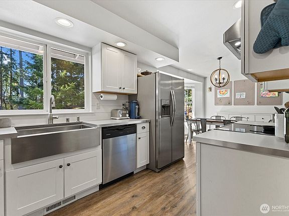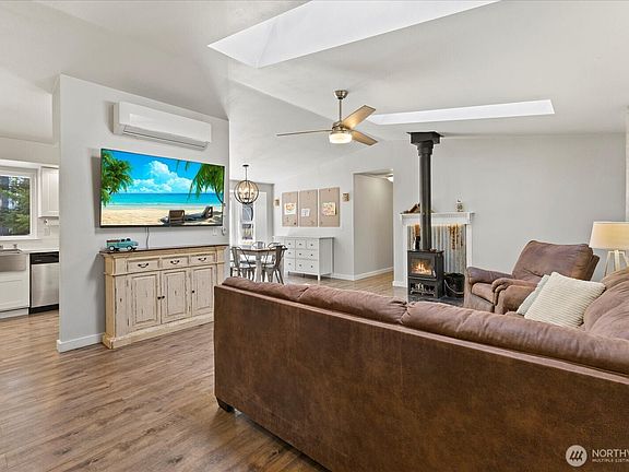 Wonderful Camano Island Rambler on over an acre on a private corner lot. The covered front porch welcomes you in ~vaulted ceilings, LVP flooring, updated kitchen, bathrooms, trim & doors. Mini Spit for heat/AC (2024), mudroom, carport/dog run & RV parking, New Roof & Water Heater in (2019). Kitchen w/ white cabinets, SS appliances & a farmhouse sink. Living room w/ newer woodstove, dining room off the kitchen & a family room. Huge sunny backyard w/ a lg patio, gazebo, raised garden beds, fruit trees & a wooded area, partially fenced w/ a double gate & 2 sheds. Primary suite w/ private bath & 2 other bedrooms + a hall bath on the opposite side of the home. Desirable North-End location close to beaches, boat launches & golfing. Welcome home!