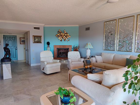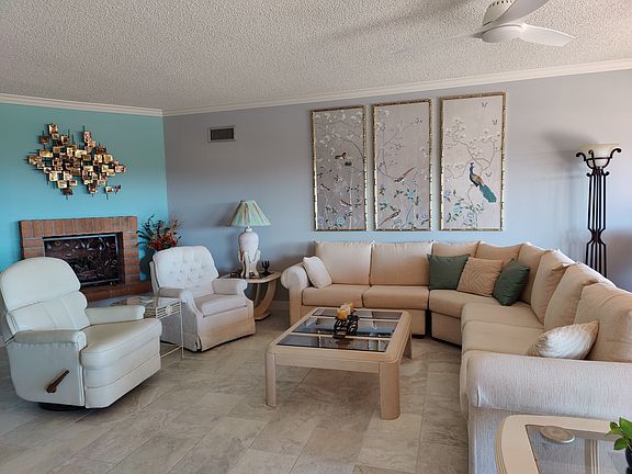 Both full bathrooms have been professionally designed and beautifully remodeled. Gorgeous porcelain tile floors run continuously throughout the home except for the bedrooms, which have newer plush carpet. The kitchen has extensive sunset views with palm trees and Italian cypress dotting the landscape, and has been recently upgraded with new stainless steel appliances, sink, faucet, and a lovely Mexican tile backsplash. The gas log fireplace provides cozy warmth on chilly evenings and our guests can indulge themselves with a Sharper Image massage chair in the living room. There is a new washer and dryer and a 2-car garage. A newer HVAC system and ceiling fans in most of the rooms ensure our guests' comfort.