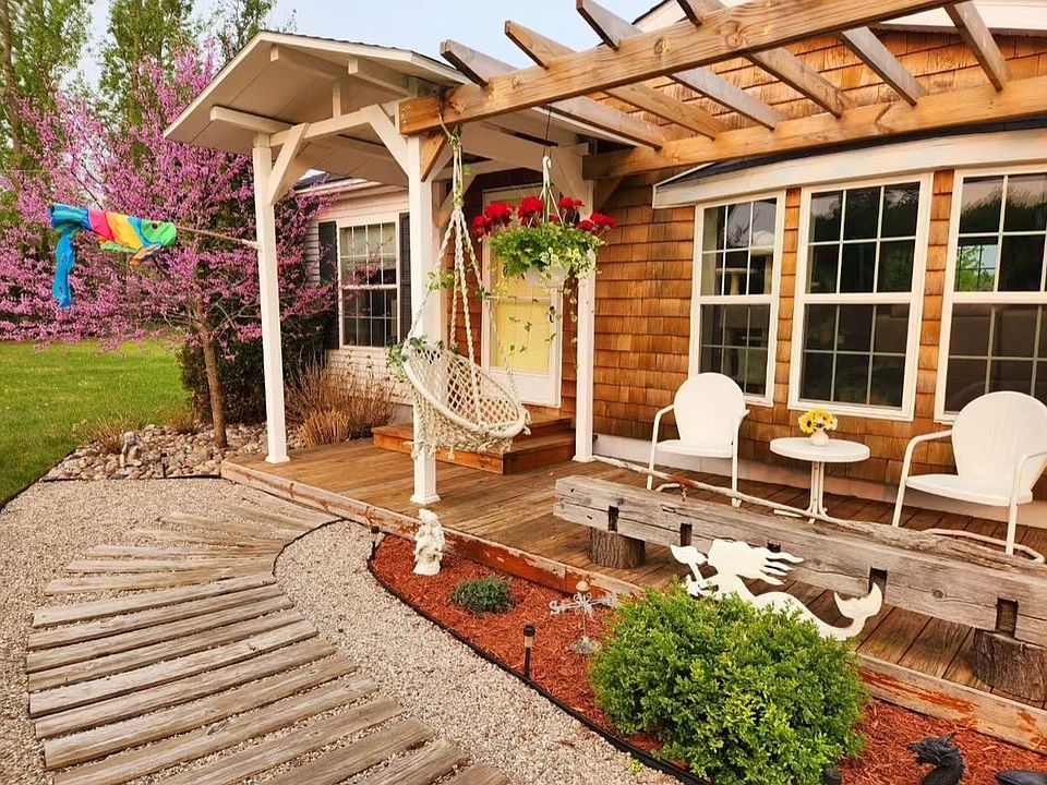 Two sheds, one as the classic she-shed, complete with planters and a concrete pad.
