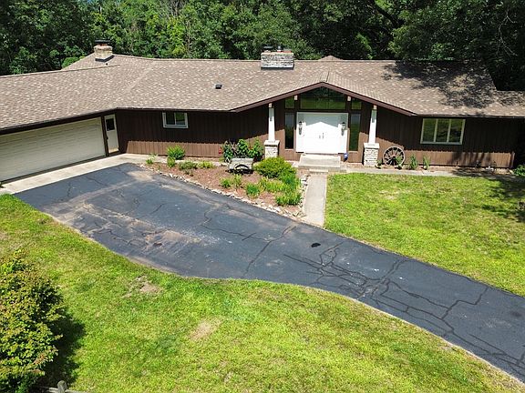 Surrounded by over 5 acres of scenic rolling woods, this spacious ranch walkout boasts a sharp double door entry-stepping into huge foyer & dramatic cathedral ceilinged living room with abundance of windows- deck across back of home overlooking dense woods. Adjacent room has stone fireplace & extra room. Some updating is needed. Kitchen has newer appliances, double oven, desk. Primary bedroom has updated bathroom. The deep garage has extra room with workbench. Lower level walkout has rec room. There is 14' x 18' storage room with exterior overhead door. Barn with many possibilities. Roof, many windows, 4 Mitsubishi split units added in 2016,