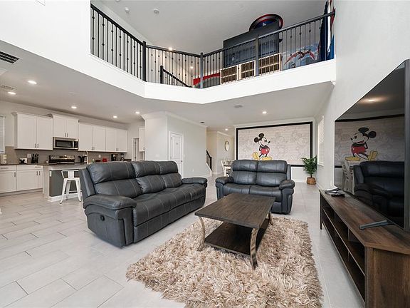 Some photos have been virtually staged. Welcome to a life full of magic in this fully furnished 5-bedroom, 5-bathroom home in Champions Gate, decorated with Disney themes that transform every corner into a unique experience. Four of the bedrooms feature charming themed decor, and the upstairs living area is also beautifully decorated, creating the perfect space to relax. The home includes a fully equipped kitchen with elegant quartz countertops, a private pool, a jacuzzi, and a serene view of the reserve that ensures privacy and tranquility. Live every day as if you were on vacation in a home full of charm and comfort. Don't miss the opportunity to make this place your new home!