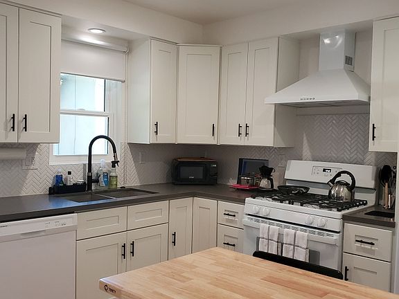 - Full-size gas range w/exhaust hood, refrigerator & dishwasher. Garbage disposal, microwave, toaster oven (and a toaster) Quartz counter tops, Melita drip coffee maker w/starter filters, whistling tea kettle, double-stainless steel sink. The kitchen includes dishes, glassware, eating utensils, a blender, dish towels, microfiber cloths, pots, pans, cutting boards, food storage containers, broom, dustpan, a Swiffer sweeper and more.