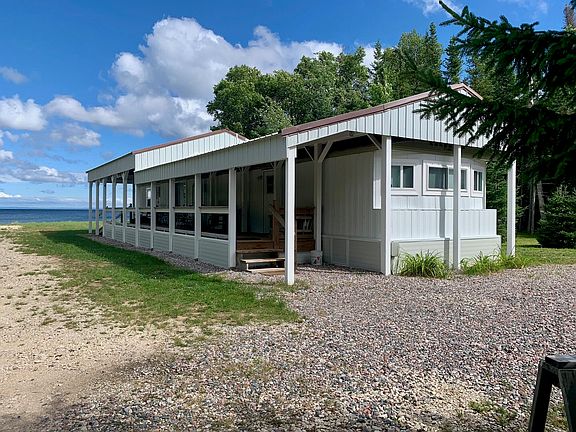 A Special Waterfront Property. 200 plus feet of Whitefish Bay water frontage on a deep 270 foot lot-purchased in 2 separate parcels not reflected in Zillow Zestimate. This property offers an impeccably maintained 2/1 mobile home with new windows, skirting, paint, freshly coated roof, new metal snow roof, new furnace and A/C. The detached 1 car garage also offers plentiful storage, one bedroom, one bath and a loft with sleeping quarters and is included in total square footage. A Bug Shack' with charming lit deck sits at waters edge offering a bar with timbers from the Vermillion Life Saving Station providing lasting evening memories. Stairs descend along the stream to an enchanting walkway and dock with seating and sandy beach. An electrical stanchion for campers, Generac, newly topped seawall, and plentiful landscaping complete the picture. Included are appliances and many furnishings. No expense has been spared on the extensive seawall and a well groomed grassy path follows the shoreline - where neighbors are friends and friends are neighbors. Glorious sunrises, distant passing freighters, the haunting cry of the loon, and the blue hills of Canada are here to behold. Truly must see to appreciate.