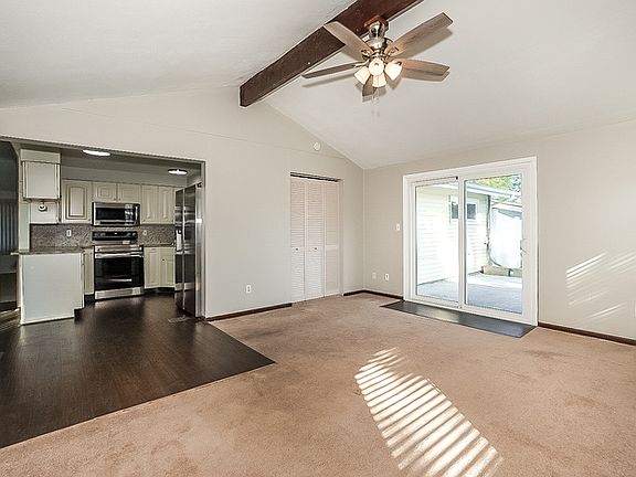 Stone mantleWraparound counterSliding doorsAdditional parkingExposed beamTall ceilingsNeutral-colored walls