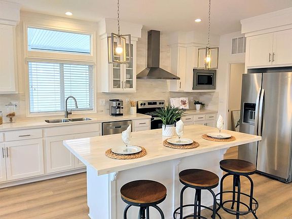 Magnificent brand-new home at the top of the hill with amazing views plus, YOU OWN THE LAND! No expense was spared in building this gorgeous TOP OF THE LINE home with attached 2-car garage. You will love spending time in the enormous great room taking in the views through the floor to ceiling windows! Cook gourmet meals for your friends and family in the spacious kitchen featuring stainless steel appliances, beautiful hardwood cabinetry and abundant counter space. The quartz topped kitchen island is accented with designer pendant lighting above. Off the great room is a large bedroom (or office) with French door entry. The spacious primary bedroom will be one of your favorite rooms featuring a spa-like athroom with step in shower, dual sink vanity and designer tilework. Plus, you get a spacious third bedroom and a separate laundry room. Other upgrades include solar tubes, crown molding, coffered ceiling, ceiling fans, subway tile flooring in baths, and upgraded garage door to name a few. This lot features a large side yard with covered patio for outdoor living. Another huge upgrade of this ground set home is the attached double car garage! Come get settled in and you may not ever want to leave! Amenities include pickleball, tennis, bocce ball, swimming pool, fitness room, putting green, dog park, and many fun planned activities. Champagne Village is a luxurious, gated, active adult Golf Country Club community adjacent to the world-famous Welk Resort! You will feel like you are on vacation every day! Tucked away in the hills just north of San Diego, but just 30 minutes to beach, Temecula wineries, San Diego Zoo Safari Park, and more. Oh, and did I say View?!! This is a MUST SEE! Call now! FHA Approved for the best loan!