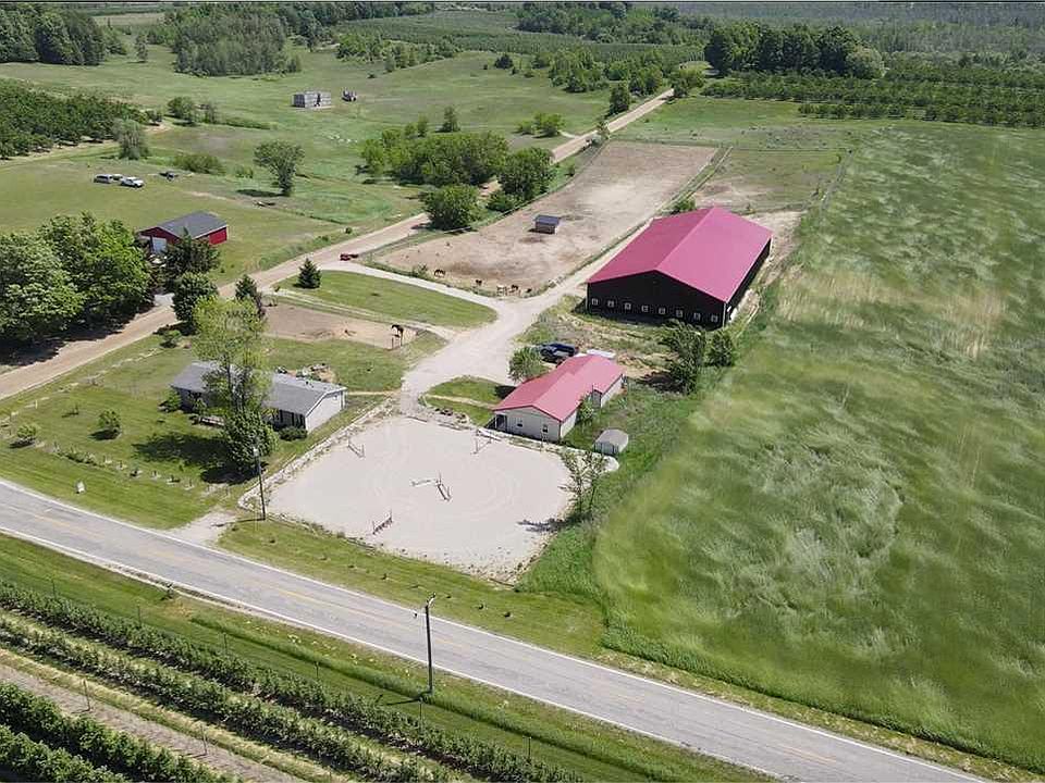 This 5.9-acre property is designed for the equestrian lifestyle - it comes complete with fenced pastures/paddocks, a nearly-new 12,800 sq.ft. (80x160) indoor riding arena, and it's less than 3 miles from Flintfields, home of Traverse City Horse Shows! Additional infrastructure for horses includes a heated stable with 7 stalls and an overhead door, 3 stalls (partially framed) in the indoor arena with plenty of room to easily add many more, and a small outdoor arena. The home has undergone a total renovation - new kitchen, baths, flooring, appliances, deck, etc. Highlights include pristine white cabinetry and granite counters, a fireplace in the spacious living room, and a primary suite with a private bath. In addition to the home on the property, there is also a gem of a building site on the eastern 2-3 acres - slightly elevated for views and adjacent to a neighboring sunflower field. This is a great property for a equestrian to call home-away-from-home while competing in show, or a wonderful opportunity to put down some roots with the necessary infrastructure already in place.