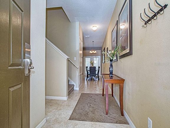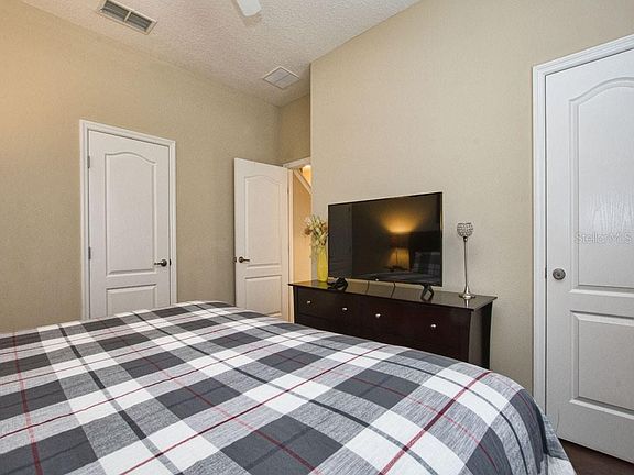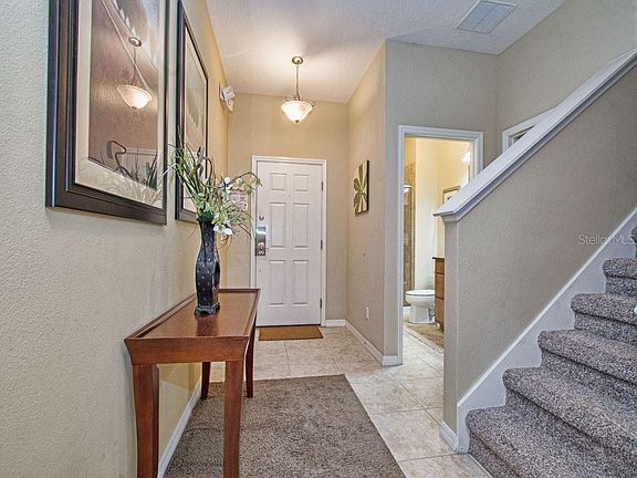 GREAT LOCATION, one of the best in the community! Close to clubhouse and view to the great landscaping and palm trees! South facing patio/pool area! Luxurious Beautiful townhome in immaculate turn-key condition. The home is professionally decorated with high quality furniture. The home is sold fully furnished, with TV's in all bedrooms. Ready for rentals and are in a current rental program. The large screened in patio has a Heated Splash Pool. Paradise Palms is private gated resort community. Just 10 minutes from Disney! Built in 2008 this stunning villa was designed for luxury and awaits you in this well-appointed and tastefully decorated retreat with granite countertops in the Kitchen and Bathrooms, clean stainless steel appliances, Maple Wood Cabinets and 18" tile throughout the first floor. This professionally decorated townhome includes all fine quality furnishings, linens and wares. New floors in downstairs bedroom and stairs/hallway upstairs. Spend your days relaxing at the 9,500 square foot Club House featuring a TikiBar & Grill, waterfall resort style pool with a grotto/spa and a pool slide for the young ones. A separate children's pool area, movie theatre, game room, internet lounge, basketball court, tennis court, state-of-the-art fitness center & sauna, market, deli, beach volleyball and more. Dues includes resort amenities & staff, plus townhome cable, internet & phone, townhome's exterior care and insurance. Paradise Palms Resort is zoned for short term rental and has a 24 hour manned security gated entrance.