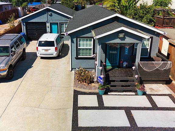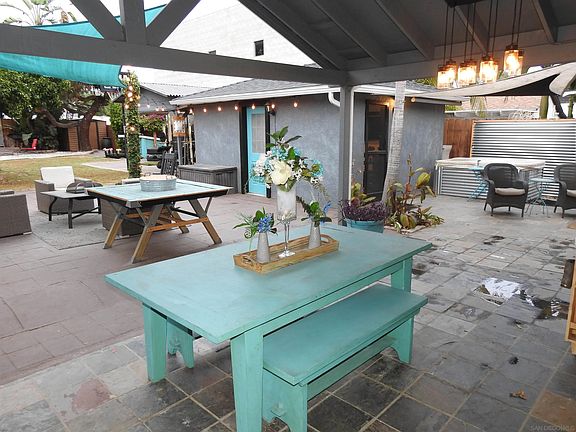 No need to go on vacation when you can live the San Diego outdoor lifestyle at this well maintained two-bed one-bath home that features two detached structures currently being used as a craft room and exercise studio. Newer roof, AC and driveway with room to add another bedroom and bath or utilize the HUGE yard for entertaining, recreation & pets. Full size stacked laundry near kitchen with lots of closet and attic storage. Approximately 1/2 of the two-car garage was converted to a bedroom that has direct access to home and driveway. The 1-car garage has a pass-through from the driveway to backyard through double doors. Driveway features hookups for an RV with sewer, electric and water. Two covered patios feature gathering spaces with a built-in bar and outdoor kitchen, hot tub, dog run, doghouse with solar cooling shed, fire-pit, garden fountain and fruit trees. Buyer to satisfy self as to square footage and room sizes. Great value for an owner occupied residence or possibly short term rental.