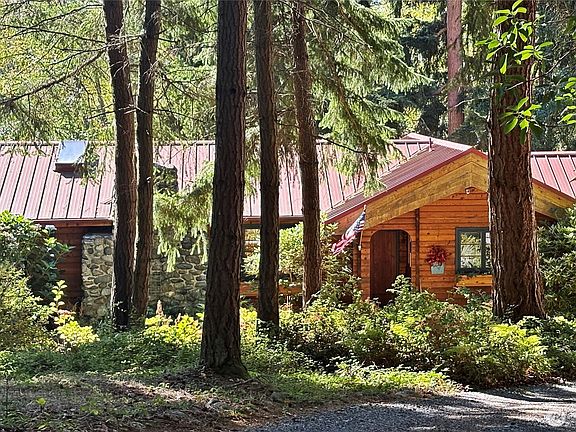 RARE 5-acre park-like setting + beautifully updated Pan Abode custom cedar home. Fresh, light, bright rambler w/just the right amount of light natural wood. Stunning new lighting fixtures, new flooring & more. 2 bdrms, ofc/den + fab Great Room adj to updated kitchen & eating space. Huge deck runs along west side of house, enjoy large covered pavilion, overlooks pond below. Explore the 1008 sf 2-garage/shop/carport w/2 hobby/offices + upstairs stg. Take take plenty of extra time to walk around the stunning outdoor garden centerpiece: A completely deer-fenced orchard & raised garden beds that surround a very cool glass-enclosed 340 sf Gazebo. This is a property of a lifetime, built for memories. Acreage framed w/evergreens & deciduous trees.
