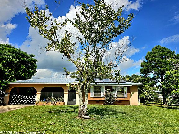 Metal roof installed in 2021. Easy to use accordion shutters installed in 2020, offering peace of mind, as well as those insurance deductions! Beautiful French doors with integrated blinds lead out to the huge back yard- so no annoying sliding doors! Photovoltaic solar module system installed in 2024 to cut those electric bills. The large interior laundry room is super convenient and offers a surplus of storage space. The welcoming screened front patio offers additional space for morning coffee or evening relaxation. There is a covered carport, a storage shed in the backyard and the location is super convenient to shopping, medical centers ,and the beaches. This oversized corner lot home in a non HOA community is ready for a new owner!