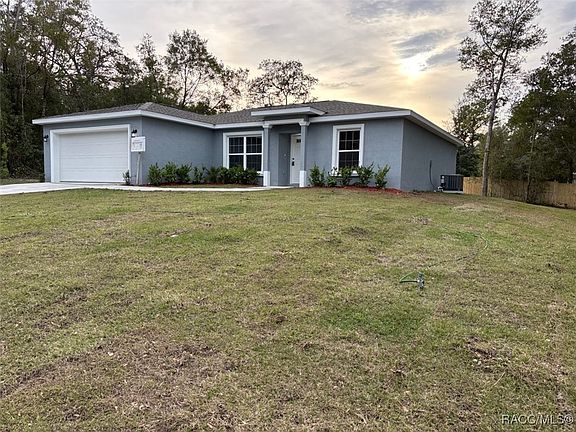 NEW CONSTRUCTION. MOVE-IN READY! This Key West Model offers an inviting 3 bedroom, 2 bathroom layout with 1,405 square feet of comfortable living space on an oversized lot in the heart of Citrus Springs. The master suite is the largest the builder offers. It is complemented by concrete block construction, a durable architectural shingle roof, energy-efficient double-pane windows, and a 10-year structural warranty for peace of mind. The living room feels open thanks to its vaulted ceiling, and the kitchen features stainless steel appliances, custom white shaker cabinets with soft-close drawers, granite countertops, and a convenient pantry. The master bathroom includes a glass-enclosed shower, and the main bathroom provides a tub and shower combo. The home has luxury vinyl plank flooring throughout for easy care. A covered patio overlooks a deep backyard with a privacy fence along the back, and the property also includes an ATU septic system. The attached 2-car garage comes with an opener and remotes, and there are no HOA fees for added freedom. This home sits in flood zone X, which is high and dry and does not require flood insurance.