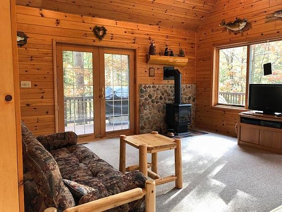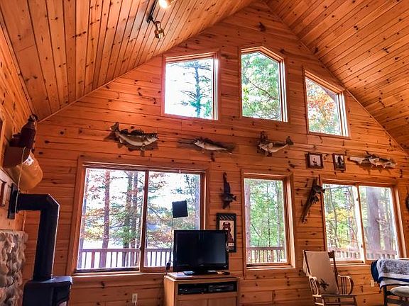 Cabin living without the hassle! This year-round cabin offers 4BR & 2BTH with an open concept kitchen and dining. The main floor provides a bedroom and full bath, as well as a pellet stove in the living room and excellent views of the lake. Upstairs there is a loft with nice views and a bedroom. In the basement you'll find 2 additional bedrooms with another full bath and laundry. The home features wood paneling throughout and has a large sundeck that overlooks the lake and campfire area. A great deck/yard combination for outdoor entertaining. The property consists of 3.2 acres and sits in an ideal location for those who want the ability to run quick errands while also having that secluded "up north" feeling. You won't believe the privacy! Schedule an appointment today.