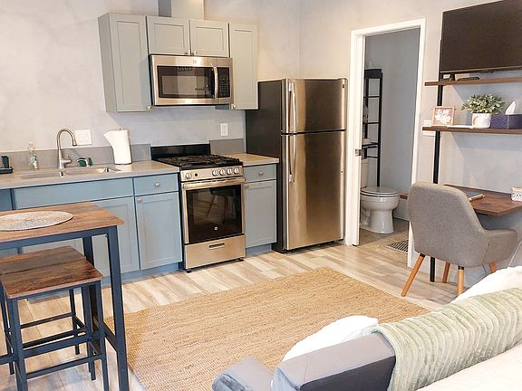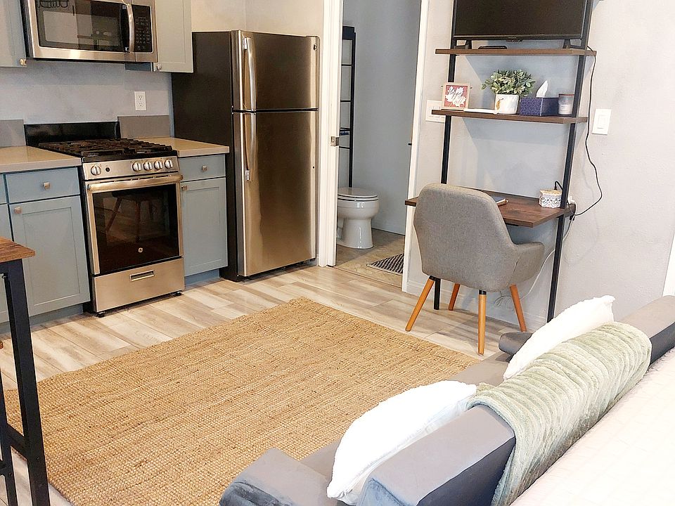 ADU studio with private entrance. Quiet neighborhood, end of a cul-de-sac. Owner lives in the main house. One parking space available. Full size stove and refrigerator in kitchenette. Has a portable washer/dryer combo. Comes completely furnished. Utilities and internet included. Month to month lease, 1 month's rent as security deposit. Pet friendly unit, up to 1 small dog and/or 1 cat, there is a non-refundable pet deposit. No smoking allowed on property. 1 parking spot available.