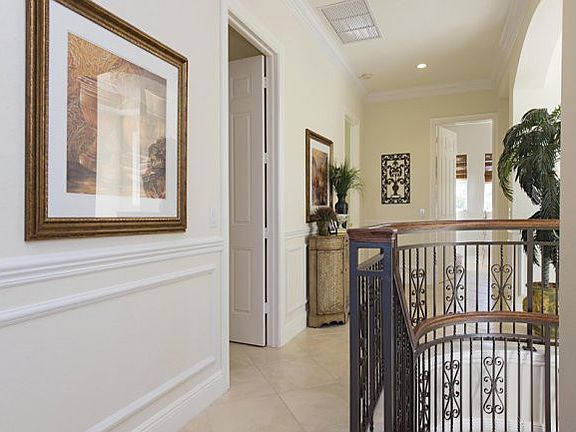 -Spacious, light and bright, upper floor end home with expansive western golf course and lake views, sunsets from large lanai. Decorator furnishings, window coverings, ceiling fans, lighting. Open kitchen with granite counters, gas cooking, upgraded cabinetry. Custom millwork, built-ins, hand-selected tile, crown molding. Room for future elevator. Close to village pool, convenient to the Club.